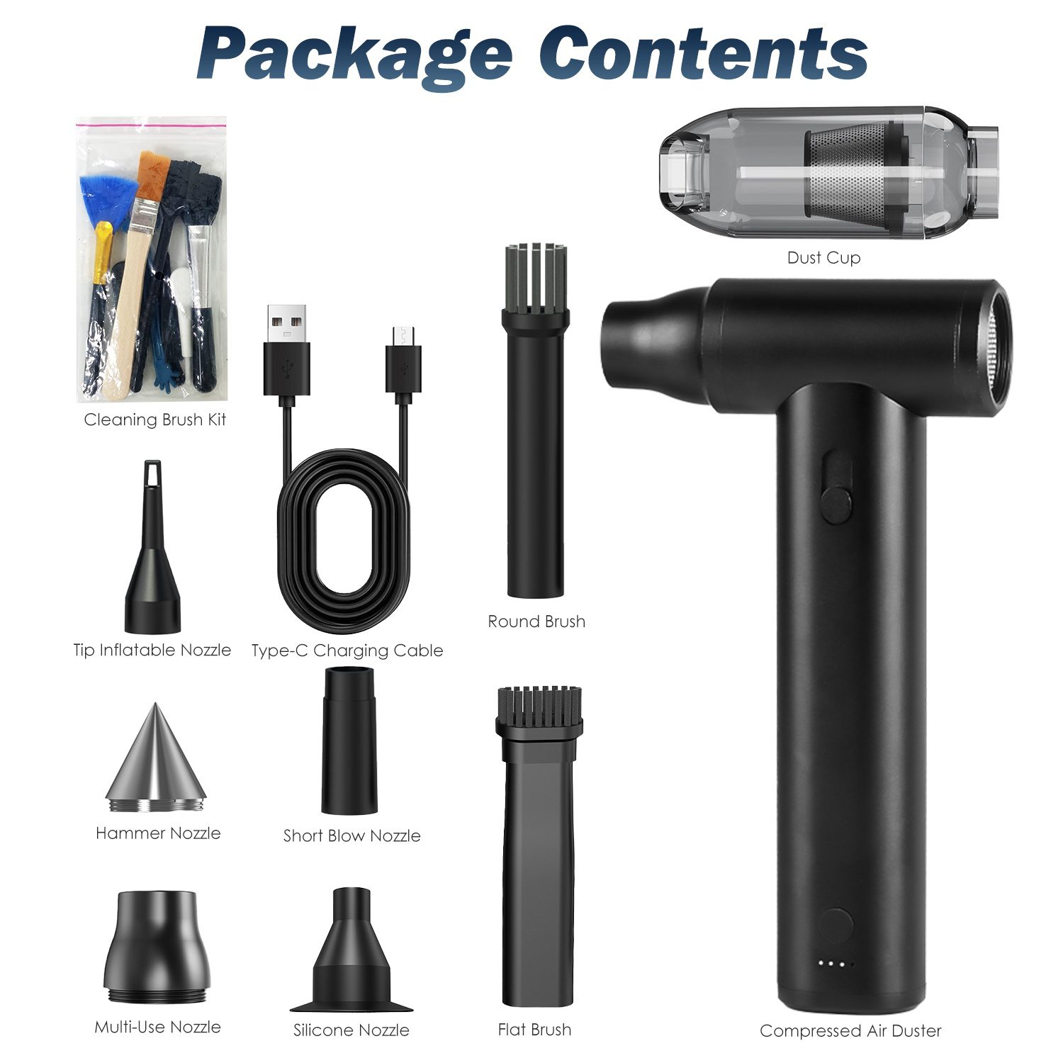 An air duster, vacuum cleaner ,and air blower in one ,the front end delivers strong airflow that effectively blows away dust and debris ,while the rear end is designed for vacuum cleaning and extraction purposes. Equipped with a powerful brushless motor, this multifunctional air duster not only enhances cleaning performance but also ensures longevity and security, including overheat, overload,over-voltage, and short-circuit protection.