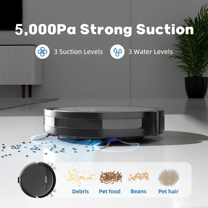The V3 robot vacuum and mop combo cleaner is an all-in-one vacuum cleaner that can vacuum, sweep and mop the floor, which is equipped with 5000Pa strong suction power with 3 levels of adjustment to clean debris and pet hair, and is suitable for various floors such as tiles, wooden floors, low-pile carpets, etc