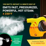 Multi-functional Steam Cleaner The handheld steam cleaner can heat up to 230 degrees Fahrenheit in approximately 3 – 4 minutes and clean stains, dust, oil and so on. Our 1050-watt household steam cleaner can clean a variety of surfaces, including ceramic tile floors, upholstery, bathtub grout and so on. Easy and Efficient There’s no need for any complicated tools or too much effort – just pour in water and heat it up.